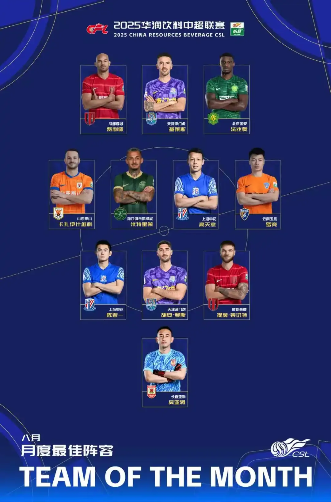 虎扑09月26日讯 今日,中超官方发布了中超联赛8月最佳阵容,本次最佳阵容采用3-4-3阵型。